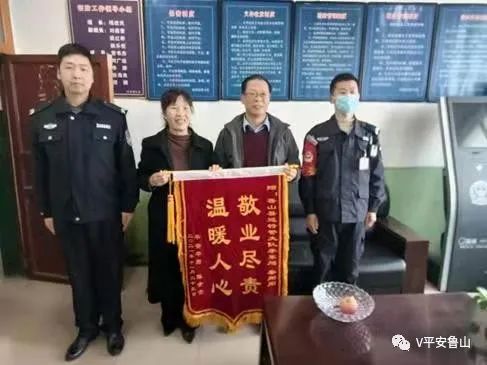 11月24日下午,鲁阳办事处居民陈某芳夫妇满怀感激之情,将一面印有“敬业尽责,温暖人心”的锦旗送到鲁山县公安局巡特警大队,以表达对沙河桥警亭特警队员秦刚刚、李东旭的谢意。
