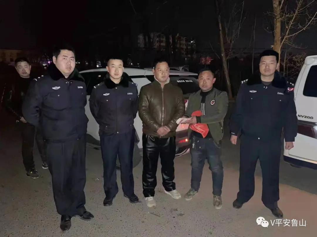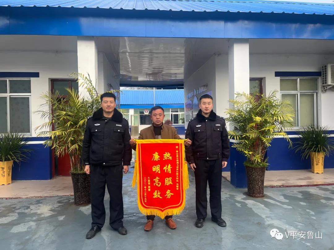 12月15日上午,马楼乡居民牛某恩拿着一面写有“热情服务 廉明高效”的锦旗送到鲁山县公安局马楼派出所王磊手中,以表示对民警一心为民找回丢失钱款的感激之情。